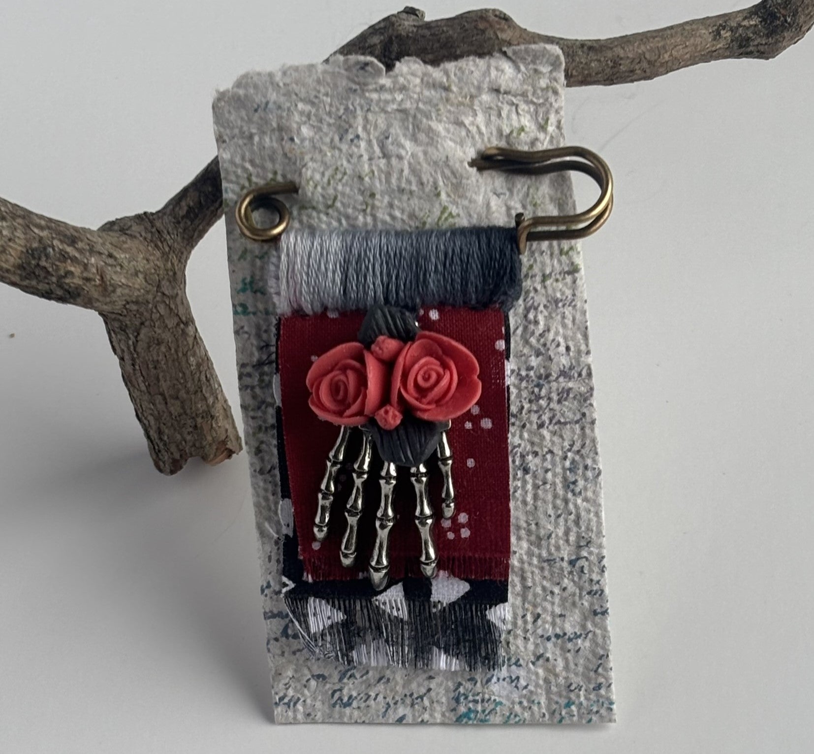 Add a touch of macabre to your outfit with our OOAK Skeleton Hand Brooch. Featuring delicate roses and grey to black ombre thread. Perfect for showcasing your dark style (and sense of humor).