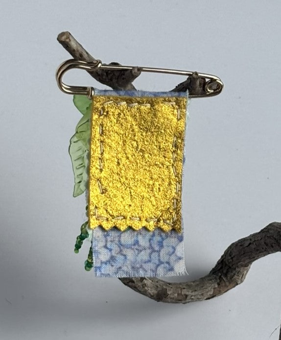 Brighten your outfit with this One-Of-A-Kind Spring Floral Brooch! Crafted with light blue hydrangea flower cotton fabric and adorned with whimsical green leaf beads, this playful accessory features a delightful cascade of blue and green beaded fringe. Pin on some springtime joy no matter the season!