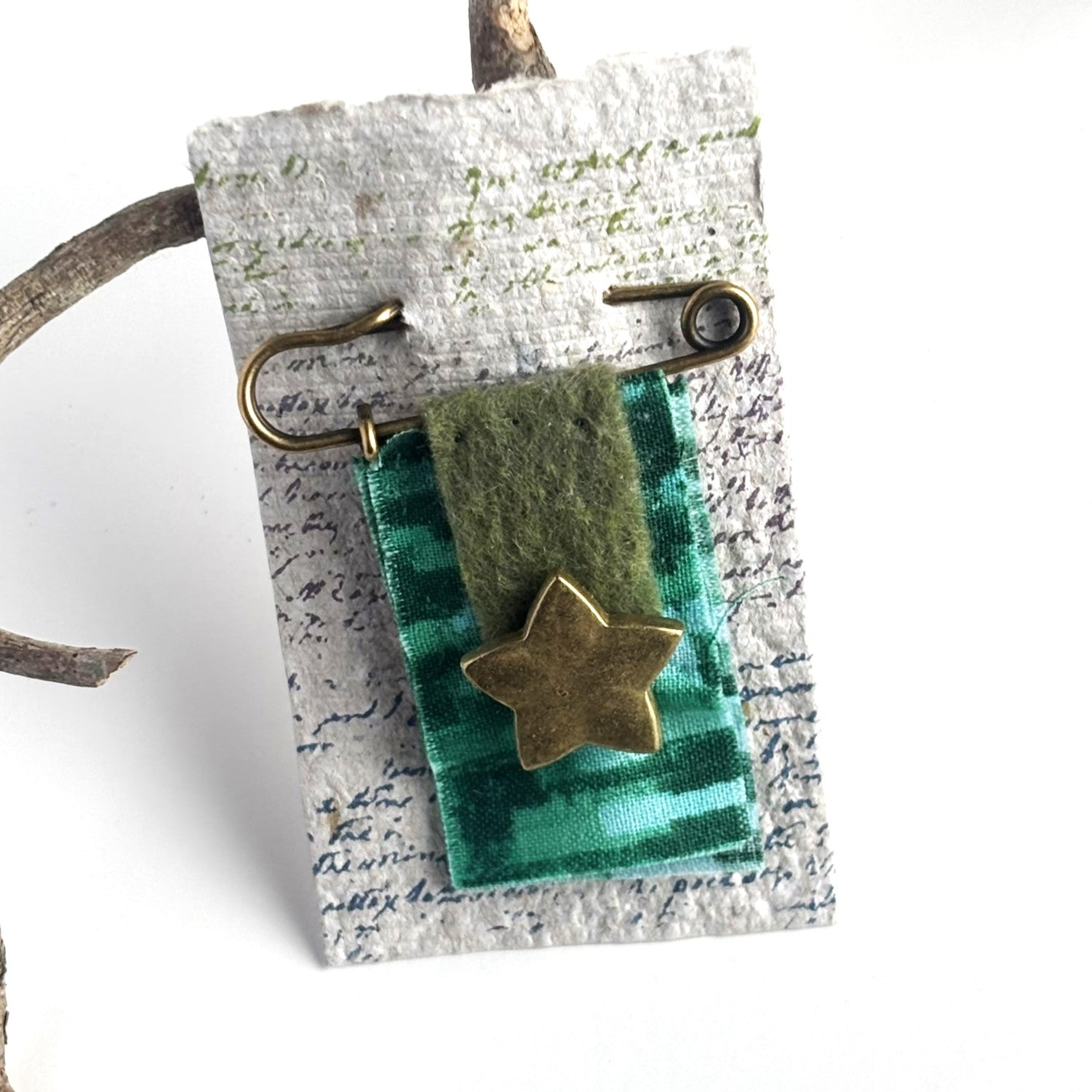 Get ready to shine with our OOAK Star Badge! This unique badge features an adorable burnished gold star button, paired with a soft and stylish sage green felt. The abstract teal fabric adds a touch of whimsy to any outfit. Don't just be a star, wear one!
